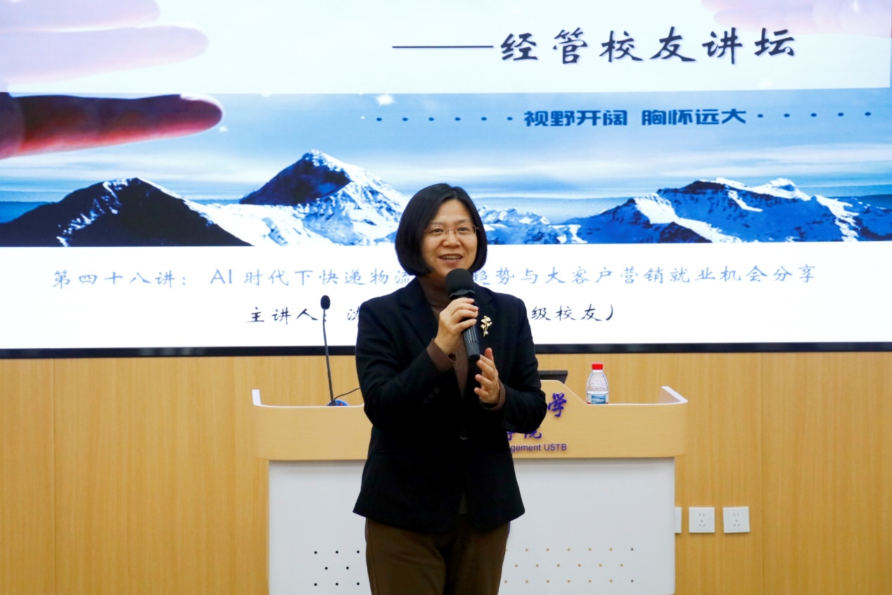 4月8日下午,成人a片“管理大视野——经管校友讲坛”第四十八讲在经管楼312举行。成人a片国贸00级校友,中国邮政速递物流股份有限公司市场部副总经理沈静受邀以《AI时代快递物流行业趋势与大客户营销就业机会》为题作分享。讲座由成人a片党委书记武森主持。